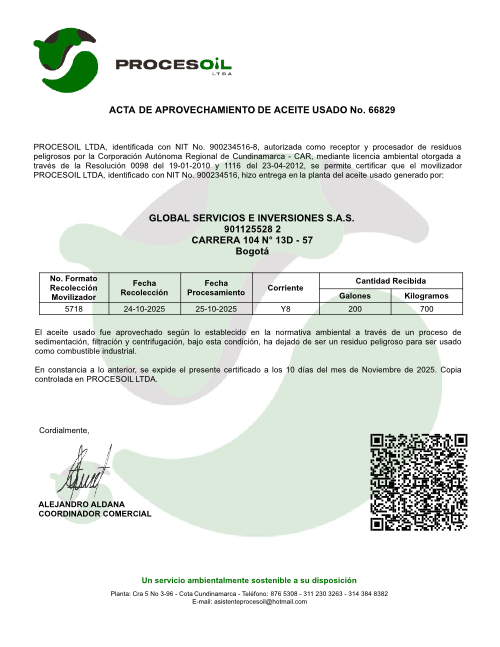 En GLOBAL SERVICIOS E INVERSIONES SAS, asumimos con seriedad nuestra responsabilidad ambiental, implementando prácticas sostenibles en todas nuestras operaciones. Como parte de este compromiso, garantizamos que el aceite usado generado en nuestras actividades es tratado de acuerdo con lo establecido en la normativa ambiental vigente.